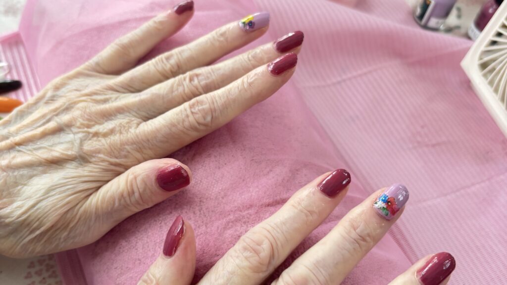 その時は喜ばれておりましたが、お部屋に戻られたら施術したことを忘れた様子。「〇〇さん、爪きれいね!」と声をかけると、「綺麗でしょ!やってもらったの!」と手を見せてくださいました。一度忘れても、自分の手を見て、ネイルをしたことを思い出したようでした。